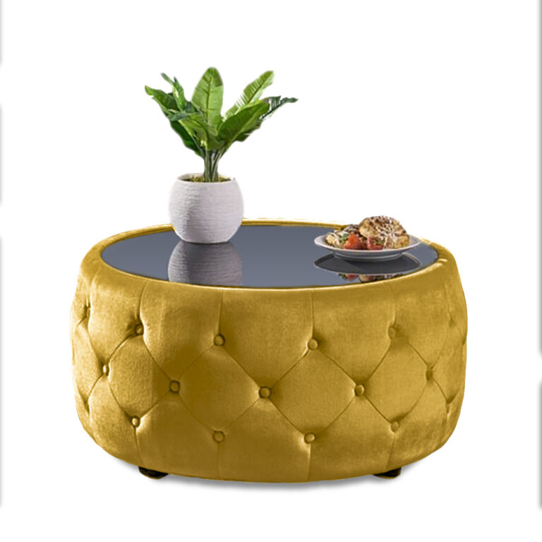 HOME PREMIUM Trae para ti, Sofisticada mesa de centro Lucy con diseño capitonado combinado con un tablero de vidrio que le aporta elegancia a tu sala o lugar favorito.